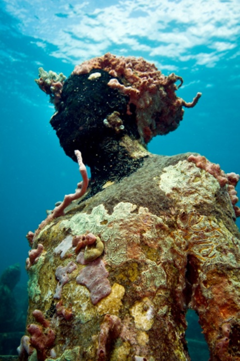What influence does the place of birth have on the later course of life? In the case of Jason deCaires Taylor one might assume that it is a big one. He was born on 12 August 1974 in Dover, a major ferry port in Kent at the narrowest part of the English Channel. The only son of an English father and a Guyanese mother graduated from the London Institute of Arts in 1998 with a BA Honours in Sculpture and Ceramics. He became the first of a new generation of artists to shift the concepts of the Land Art movement into the realm of the marine environment, scuba diving from the age of 18. The title of Taylor‘s first work, „The Lost Correspondent“ (2005), already expresses his concern about the development in the environmental sector The majority of the haunting, enigmatic underwater scenes that he creates „are based on living people who are life cast and whose phenotypical qualities alter over time as they slowly evolve from inert concrete to living artificial reefs“ (Wikipedia). „I’m trying to portray“, he said in an interview with sribol.com, „how human intervention or interaction with nature can be positive and sustainable, an icon of how we can live in a symbiotic relationship with nature.“