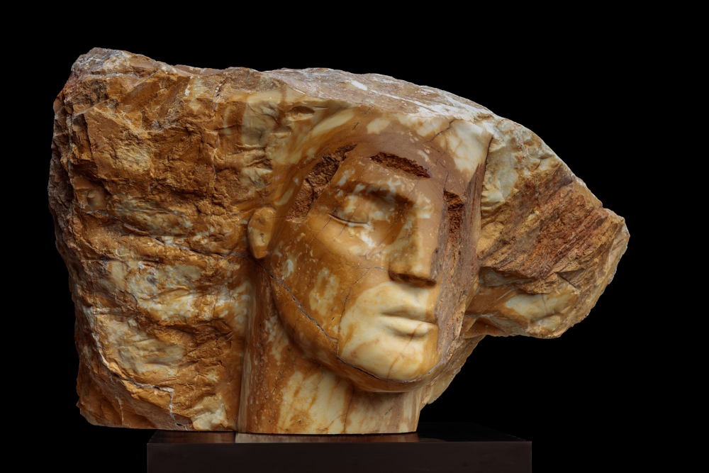 Being 17 years old, Emily Young left the bourgeois home and travelled to India, Afghanistan, Pakistan, Iran, Africa and the Middle East for several years. Upon her return „she founded Public Pictures, a community-based mural group in 1974“ (artuk.org). After having lived with Simon Jeffes, leader of The Penguin Cafe Orchestra, during the 1970s & 80s, designing record sleeves and the stage appearance for the avant-pop band, she moved on. The mother of a son, who had studied under the sculptor/educator Robert White (1921-2002) in the United States, was in her thirties, when she turned fully to sculpture. Her favourite materials are alabaster, lapis lazuli, marble, onyx, but it can be limestone, sodalite, travertine also.