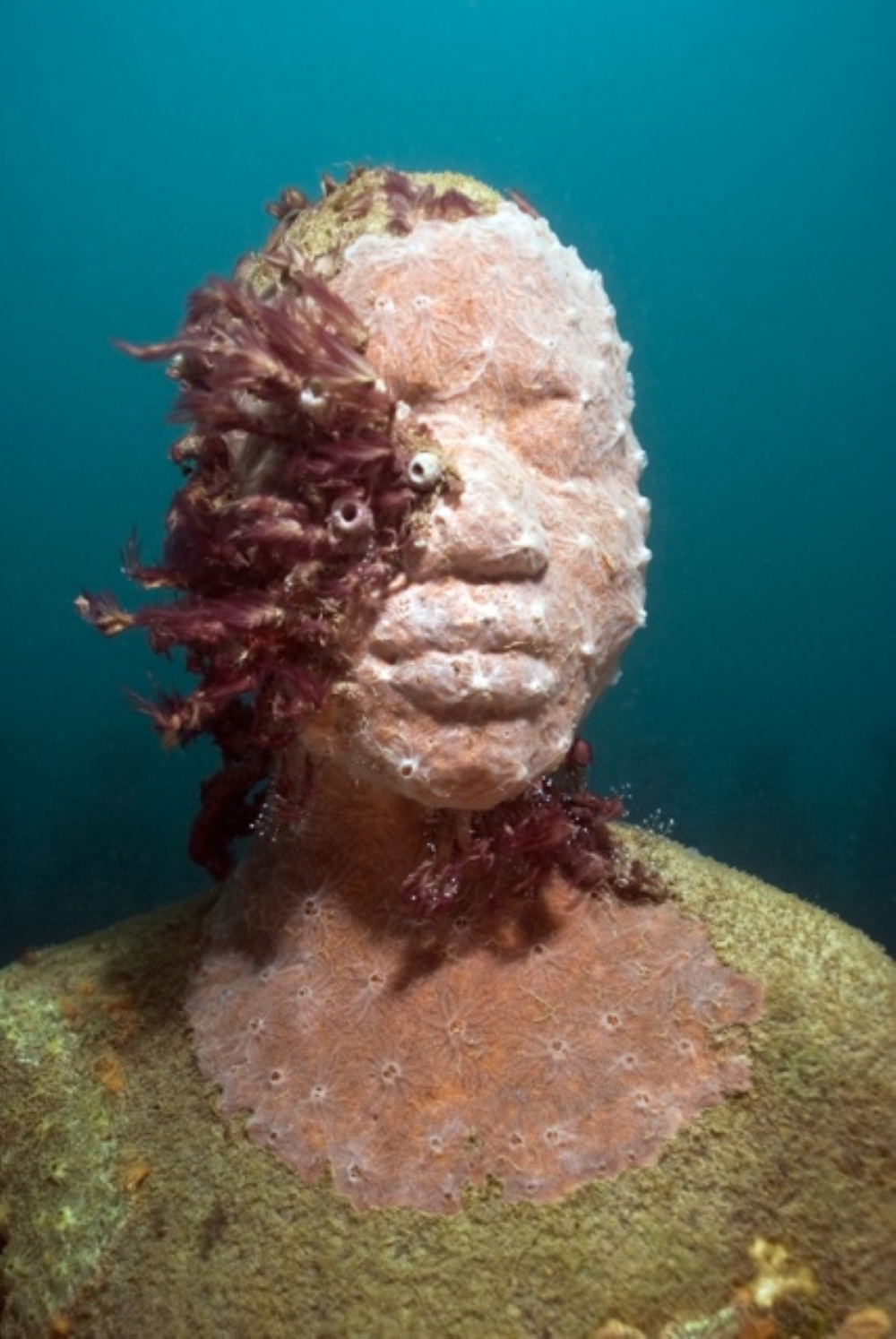What influence does the place of birth have on the later course of life? In the case of Jason deCaires Taylor one might assume that it is a big one. He was born on 12 August 1974 in Dover, a major ferry port in Kent at the narrowest part of the English Channel. The only son of an English father and a Guyanese mother graduated from the London Institute of Arts in 1998 with a BA Honours in Sculpture and Ceramics. He became the first of a new generation of artists to shift the concepts of the Land Art movement into the realm of the marine environment, scuba diving from the age of 18. The title of Taylor‘s first work, „The Lost Correspondent“ (2005), already expresses his concern about the development in the environmental sector The majority of the haunting, enigmatic underwater scenes that he creates „are based on living people who are life cast and whose phenotypical qualities alter over time as they slowly evolve from inert concrete to living artificial reefs“ (Wikipedia). „I’m trying to portray“, he said in an interview with sribol.com, „how human intervention or interaction with nature can be positive and sustainable, an icon of how we can live in a symbiotic relationship with nature.“