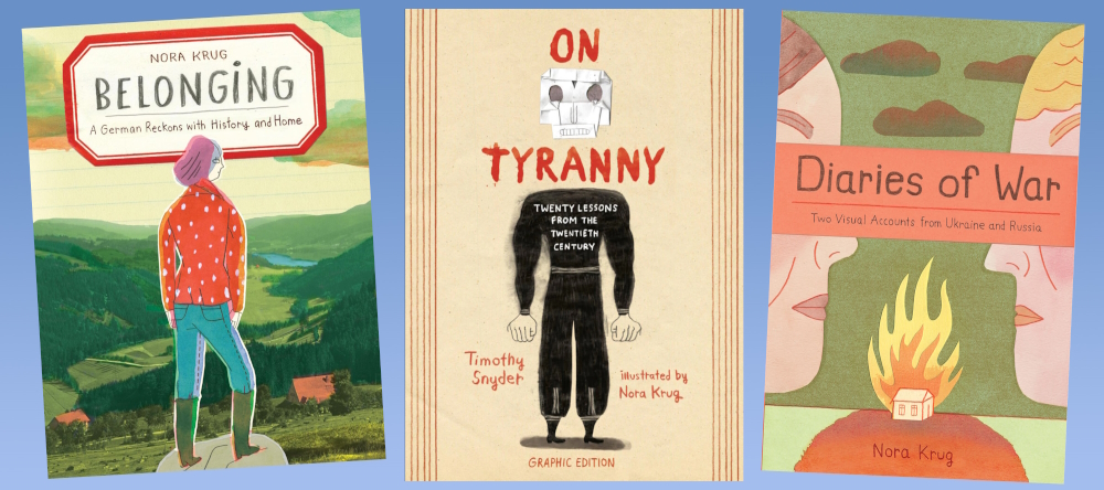 Her most popular book ‚Belonging‘ (2018) was released in 17 countries including Brazil, China, Korea and Russia. ‚On Tyranny: Twenty Lessons from the Twentieth Century‘ (2021) is a graphic edition of historian Timothy Snyder’s bestselling book of lessons for surviving and resisting America’s arc toward authoritarianism. It was chosen, among others, as The New York Times Best Graphic Novel of 2021 and The New York Times Editor’s Choice. The publication of ‚Diaries of War: Two Visual Accounts From Ukraine And Russia‘ is a collection of Krug's series that ran in the newspapers Los Angeles Times (US), El Pais (Spain), L’Expresso (Italy), Sueddeutsche Zeitung (Germany) and De Volkskrant (Holland). It will be published in the US, the UK and Spain in 2023, and in Germany and other territories in 2024.