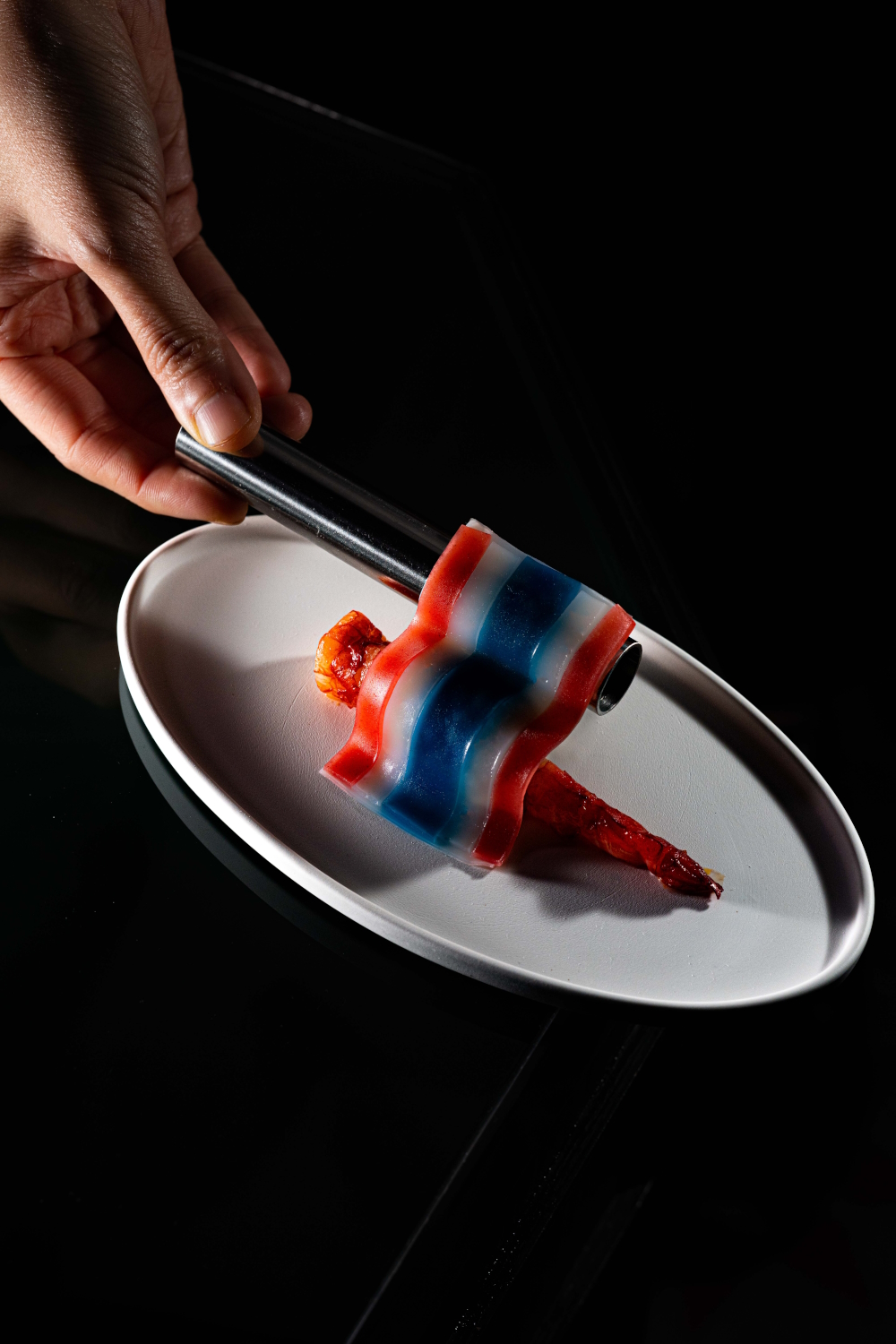 In our version, we serve it together with an actual military box from World War II, showcasing the five key ingredients that define the essence of the dish — each one symbolizing Thai flavor, memory, and resilience. The dish itself features shrimp from Nakhon Si Thammarat, a rich shrimp-head jus, and an edible Thai flag made from natural ingredients.